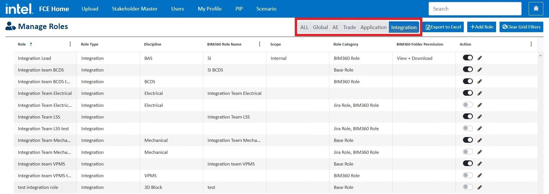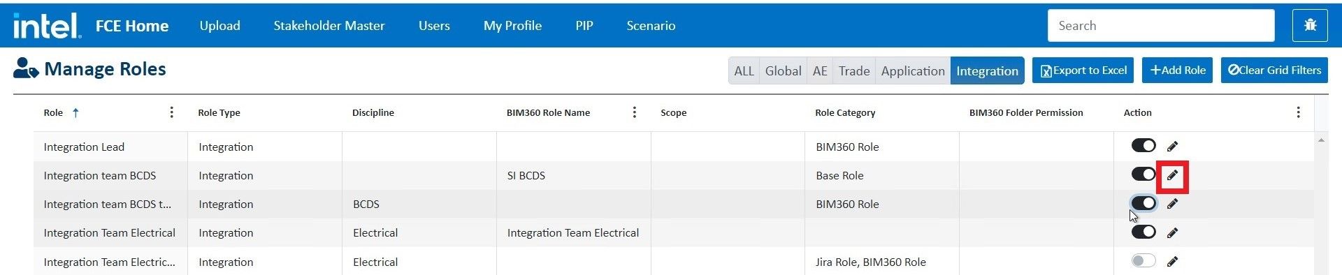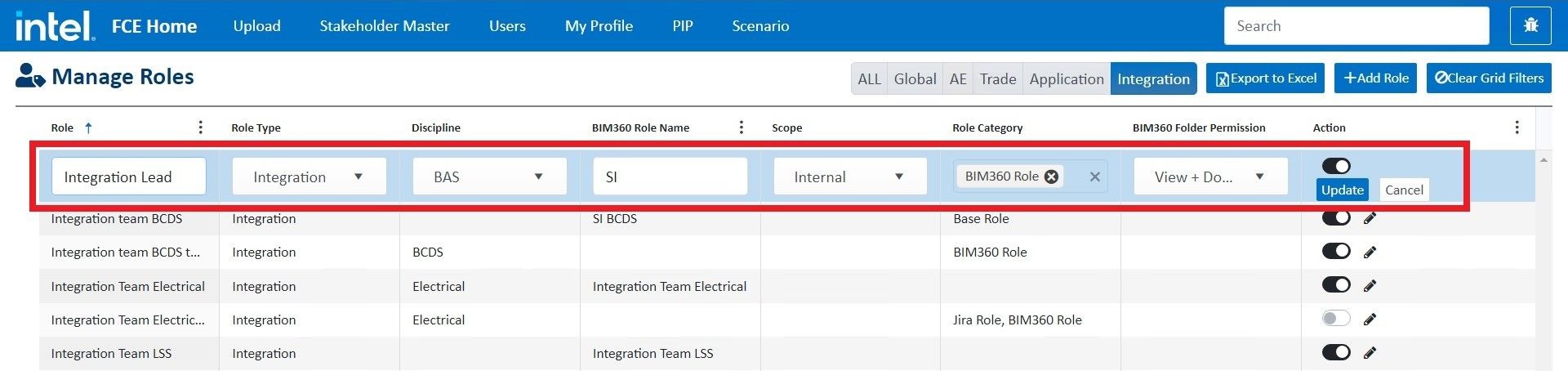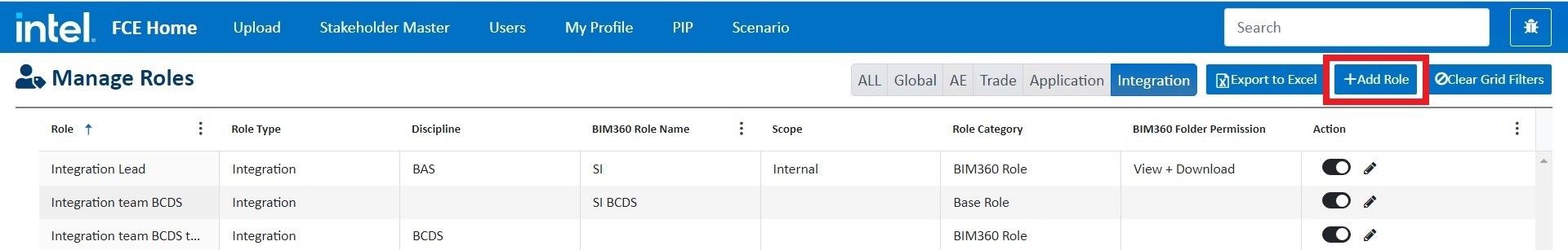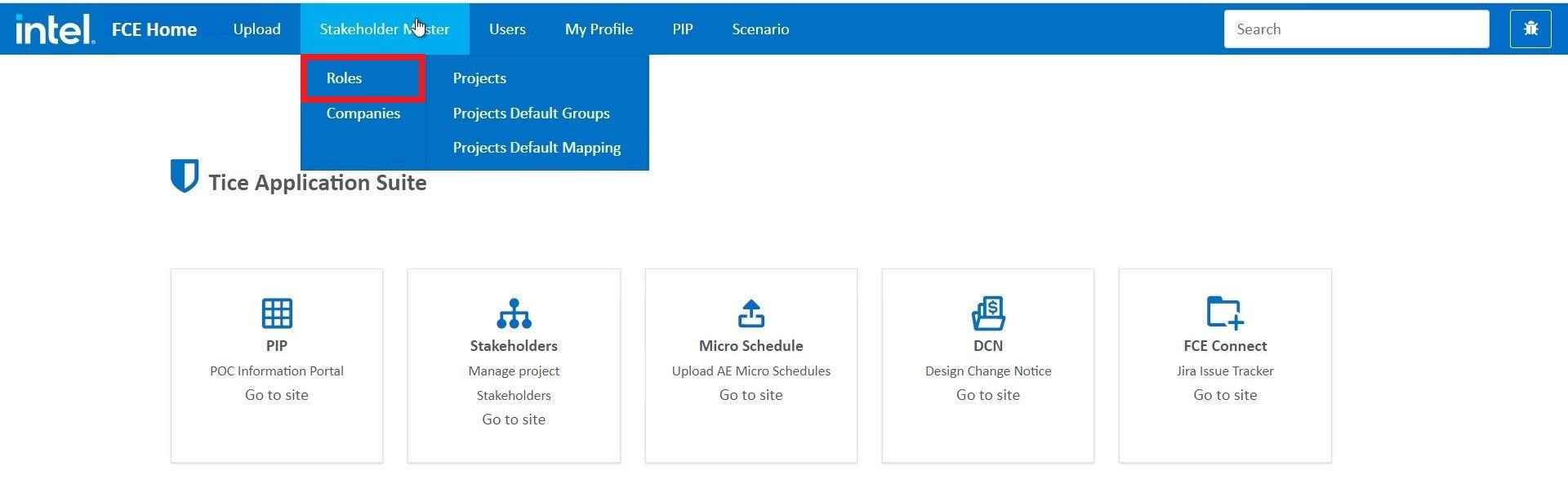Log into fcehome.intel.com and navigate to the Stakeholder Master from the top. Hovering the Stakeholder Master opens a sub-menu; click Roles from the sub-menu and it will redirect you to the Manage Roles page.