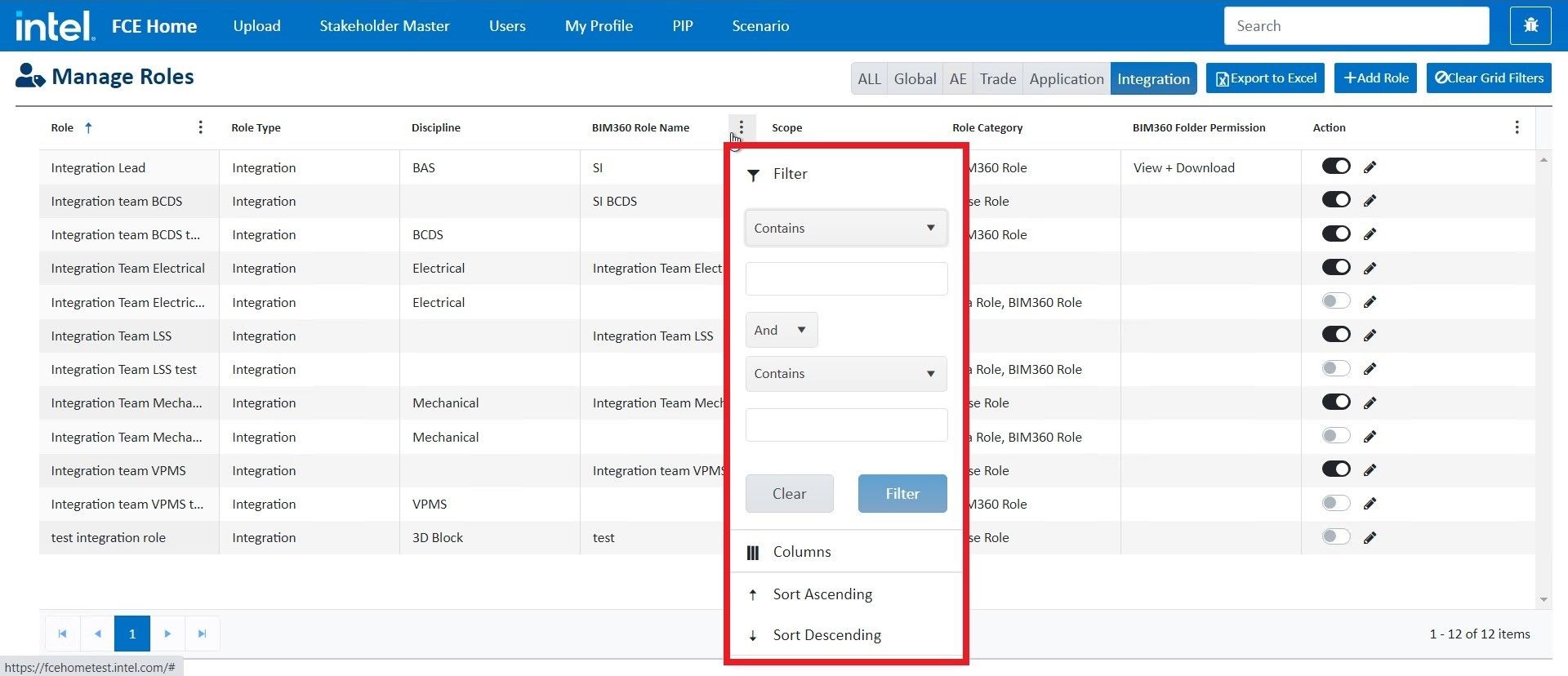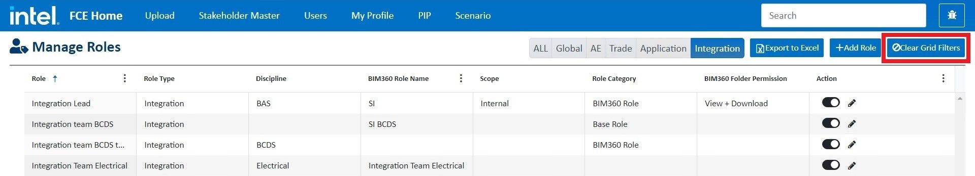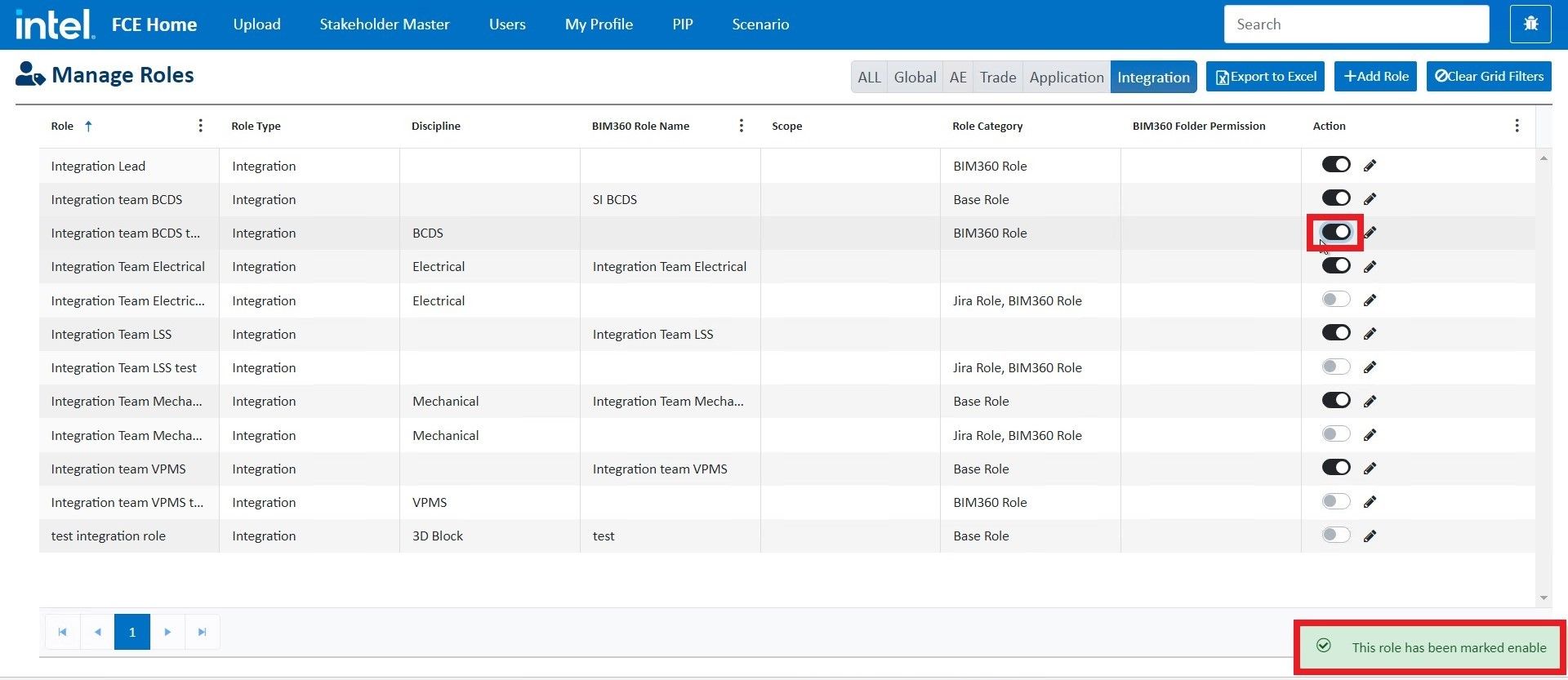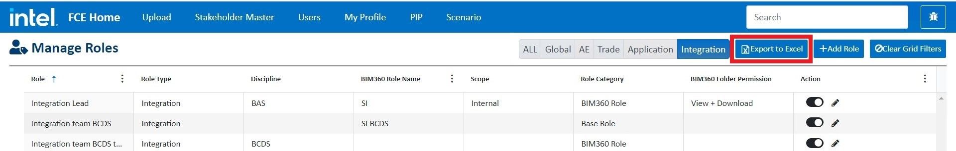 Log into fcehome.intel.com and navigate to the Stakeholder Master from the top. Hovering the Stakeholder Master opens a sub-menu; click Roles from the sub-menu and it will redirect you to the Manage Roles page.