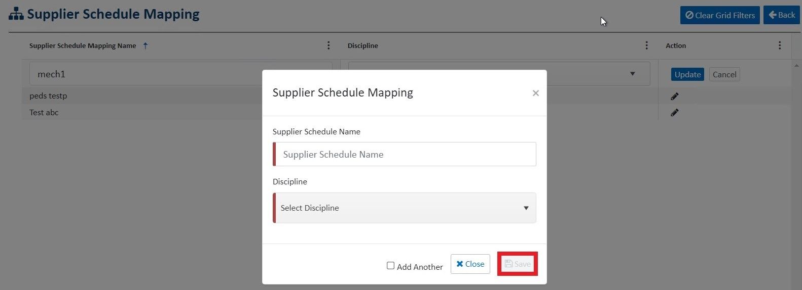 button, a new modal window opens. You enter the details such as the Supplier Schedule Mapping name, and discipline, and clickSave