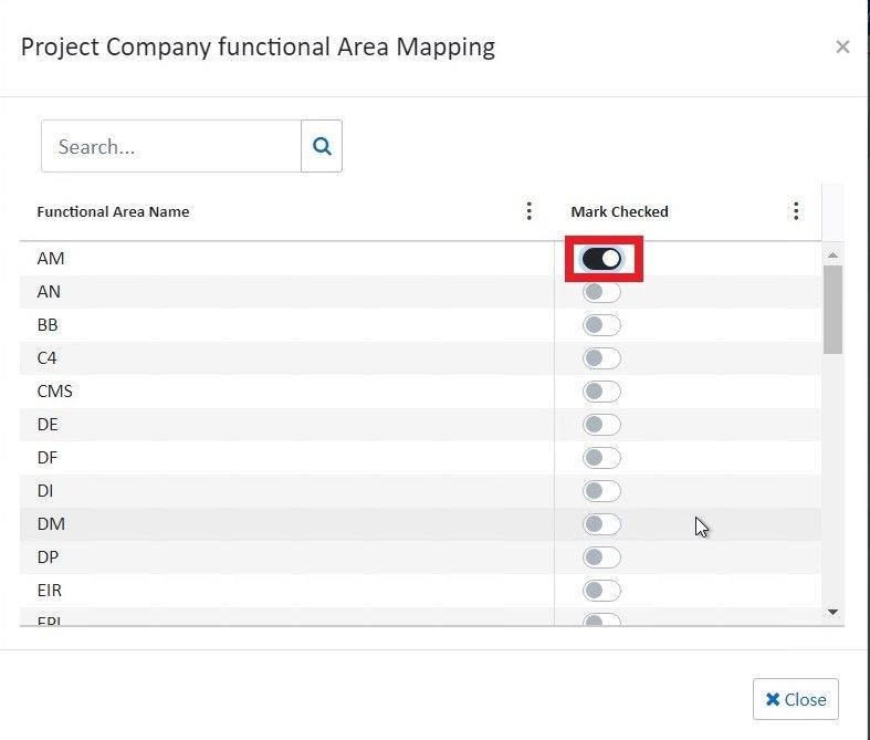 Once a project is active, you can specify the functional areas for the project by clicking the icon in the Functional Area column of the grid. It opens the Project Company Functional Area Mapping page from where mark the functional area active to map it with the company.