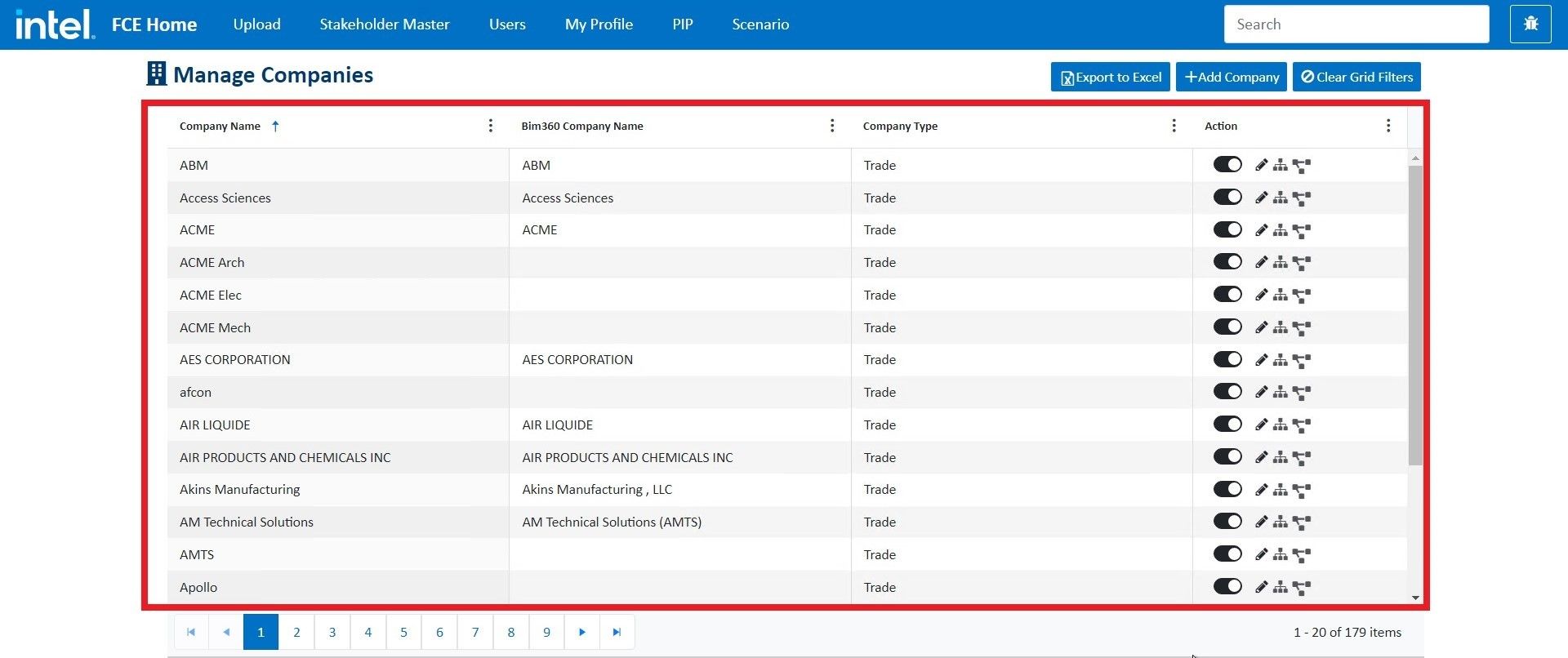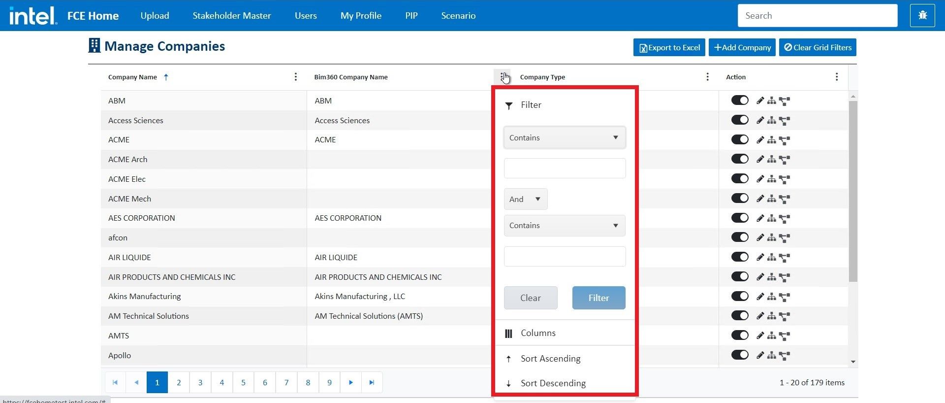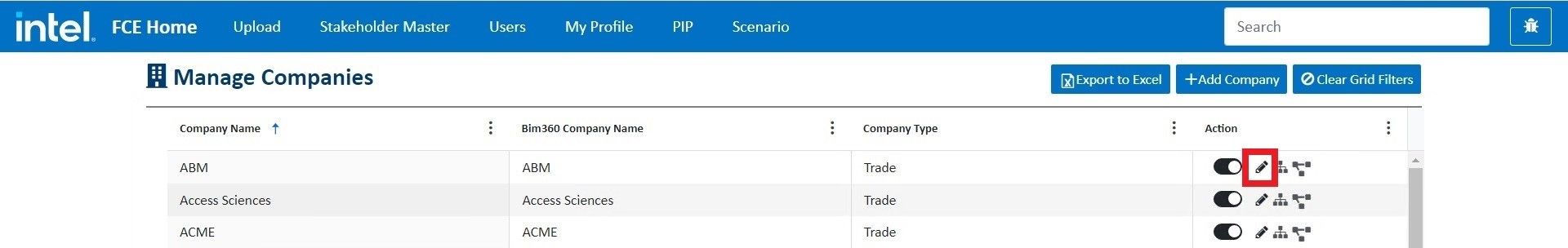 Log into fcehome.intel.com and navigate to the Stakeholder Master from the top. Hovering the Stakeholder Master opens a sub-menu; click Companies from the sub-menu. It redirects to the Manage Companies page.