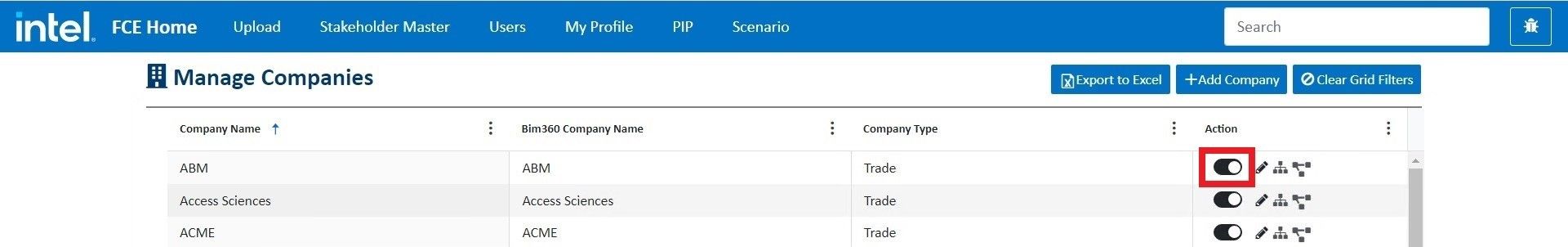Toggle on the button in the company grid to make the company active. It means the active companies can be assigned to projects further and will display on the update stakeholder page as well.